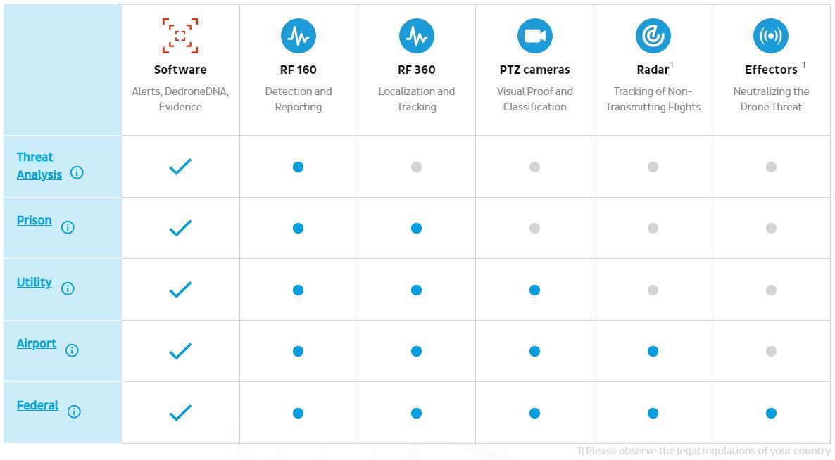 Bavak has been a partner of Dedrone for many years regarding the Drone Detection system. One of the reasons for choosing this system is the possibility to adapt it. This makes it easy to install the system for 'light' (relatively small) usage and can also easily be expanded to a very advanced system for high-profile locations. The quality remains the same, high, no matter which conversion. See chart below.